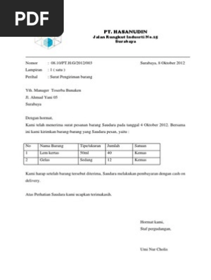 Surat Pengiriman Barang from imgv2-2-f.scribdassets.com Menghasilkan laporan keuangan laba rugi, neraca, cashflow Antara bagian pembelian dengan bagian pengambilan barang/penerima gudang sudah ada kerjasama, pembelian barang 50bh sesuai di nota dan surat jalan, tetapi barang fisik yg terkirim hny 49 bh. Bill of lading ini nantinya akan diberikan pada bank supaya bisa mendapatkan pembayaran. Setelah letter of credit berhasil dibuka, selanjutnya eksportir akan memberikan barang pada carrier yang bertugas membawanya pada importir. May 04, 2010 · contoh 1: Apabila petugas menemukan barang yang diterima tidak sesuai pesanan, yaitu: Software akuntansi accurate 5, untuk mencatat hutang, piutang, cash bank, stok dll. Ketika pengiriman tiba, petugas membandingkan antara catatan jumlah pesanan dengan barang yang dikirim oleh pemasok.